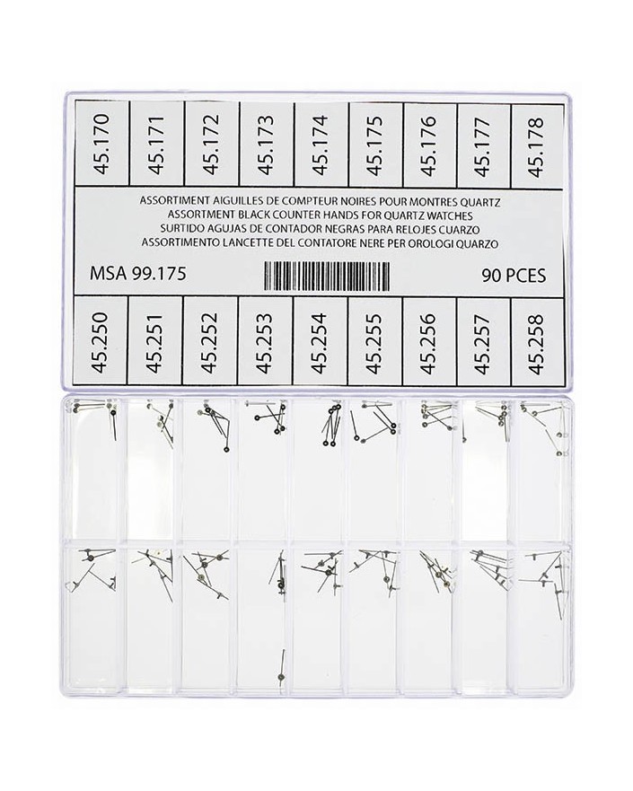 Assortment of counter hands for watches ; nickel colour and yellow.