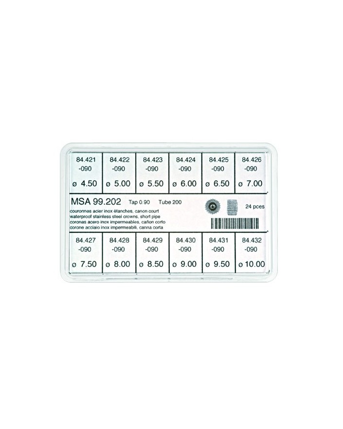 Assortment of steel colour waterproof crowns, short pipe ; stainless steel.