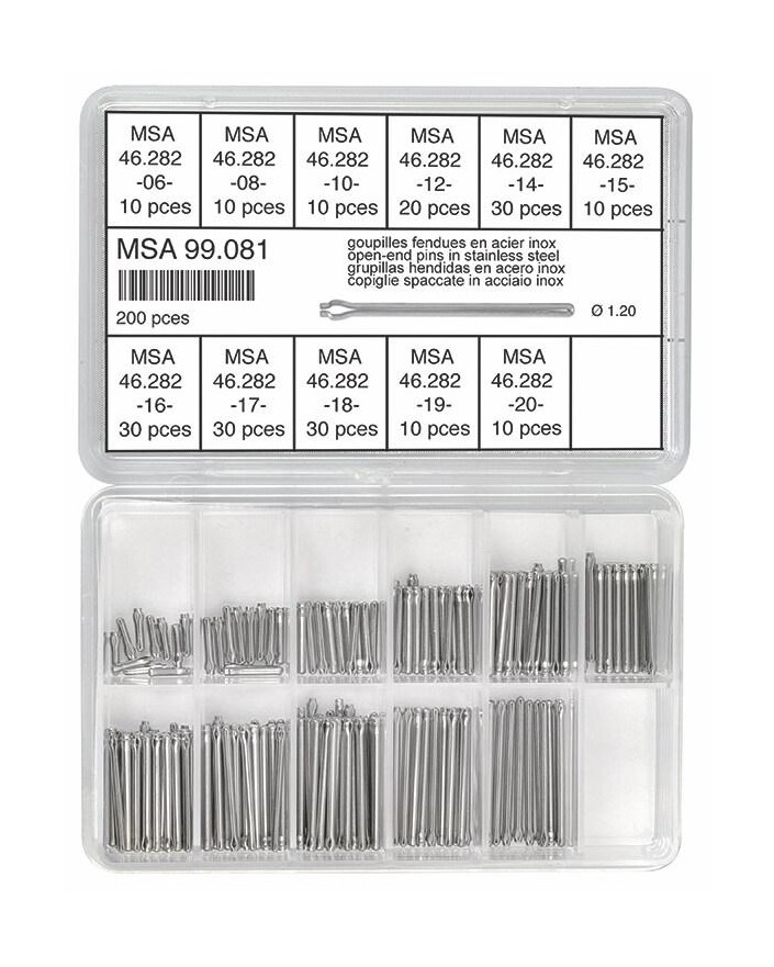 Assortment of open-end pins ; stainless steel.
