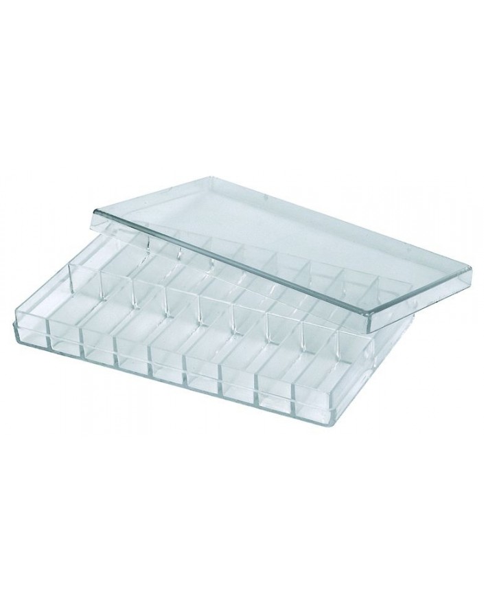 PLASTIC BOX WITH 18 COMPARTMENTS (10x29x10 mm), TRANSPARENT BASE AND LID / EXT. 108 x 64 x 13 mm