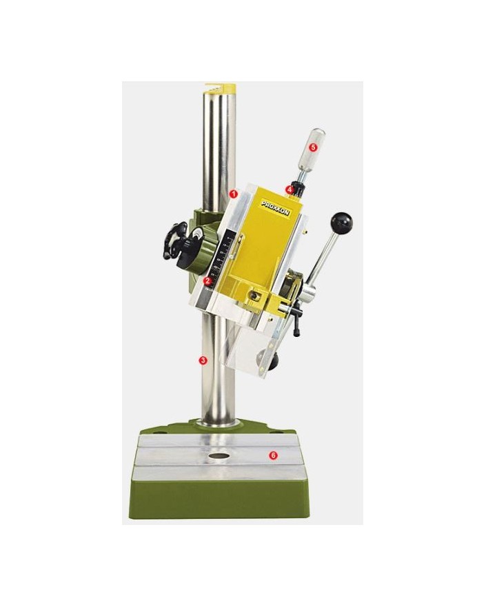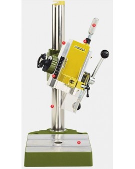 Slant drilling, varied milling without special cutters and milling of oblique holes. Switchable in fine adjustment of the milling head. Stop and graduated scale of depth. Advance by rack with high gearing for drilling without large deployment of force. Drilling column 45 mm, height 500 mm. 140 mm range (from the outside of the column to the center of the tool). 65 mm stroke. Solid tablet, milled flat, useful surface of 200 x 200 mm and 2 continuous grooves T according to the standard MICROMOT (12 x 6 x 5 mm). Simple tightening of all drills available on the market with 43 mm collar. Weight approx. 6.5 kg.