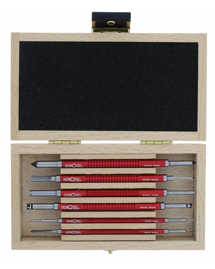 ASSORTIMENT DE FRAISES DOUBLES À ÉBAVURER ET ÉBISELER EN ACIER TREMPÉ, 6 PIÈCES + MANCHE ALUMINIUM ÉLOXÉ ROUGE / DANS COFFRET EN BOIS