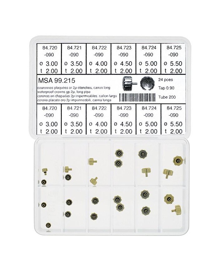 Assortiment de couronnes étanches couleur acier, canon long ; acier inoxydable.