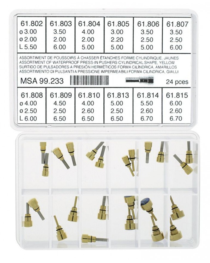 ASSORTIMENT DE POUSSOIRS À CHASSER ÉTANCHES FORME CYLINDRIQUE, ACIER INOXYDABLE / JAUNES / 24 PIÈCES