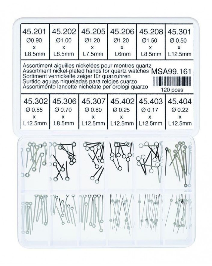 Assortiment d’aiguilles couleur nickel pour montres ; heures, minutes et secondes
