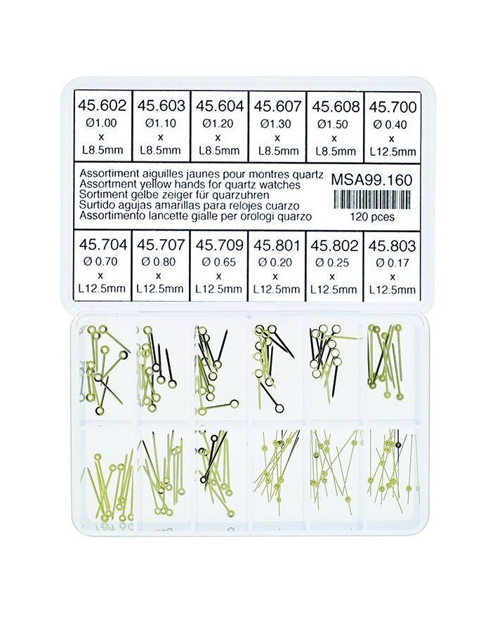 Assortiment d’aiguilles jaunes pour montres ; heures, minutes et secondes au
