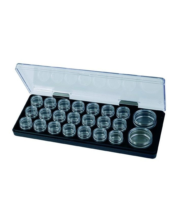 BOÎTE EN PLASTIQUE EMPILABLE AVEC 23 CALOTTES (21x Ø 24 - 2x Ø 40 mm), FOND NOIR ET COUVERCLE TRANSPARENT / EXT. 260 x 105 x 24 mm