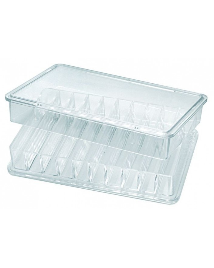 BOÎTE EN PLASTIQUE EMPILABLE À 10 CASES (46x6x6 mm), FOND ET COUVERCLE TRANSPARENTS / EXT. 84 x 54 x 16 mm