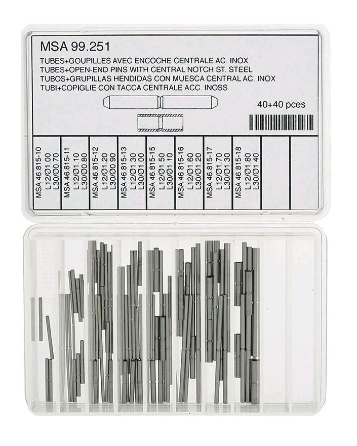 Assortiment de tubes et goupilles avec encoche centrale ; acier inoxydable.