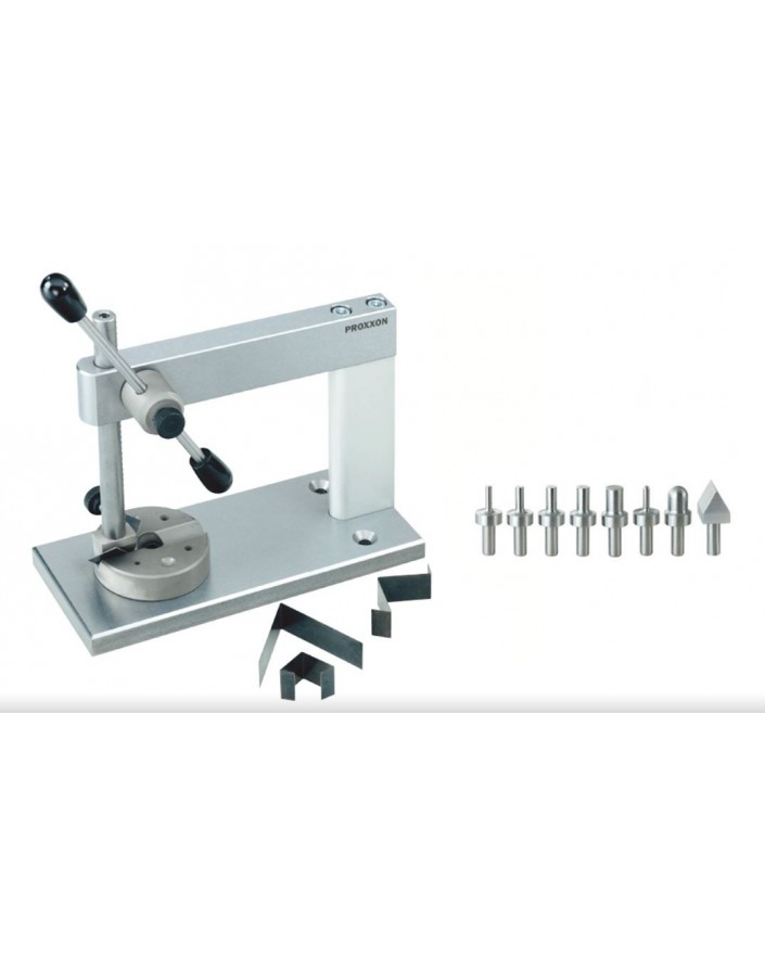 Avec 5 poinçons cylindriques (surface durci) qui se fixent dans la crémaillère au moyen de la vis moletée: Ø 3 - 4 - 5 - 6 et 8 mm. En plus un profil hémisphèrique Ø 3 et 9 mm ainsi qu'un prisme angulaire 60° pour plier des angles mé-talliques. La contrepartie est une tourelle trempée facilement réglable avec tous les forages et les matrices nécessaires pour les poinçons mentionnés ci-dessous.