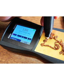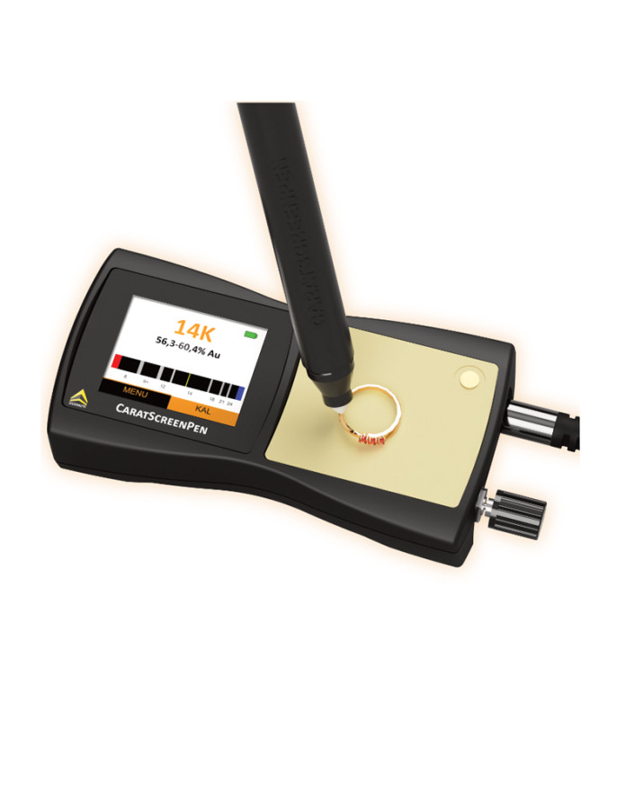 La manipulation et l'affichage des résultats sont très faciles et intuitifs, ce qui rend ces appareils parfaits pour les utilisateurs privés et commerciaux. Les bijoux recouverts d'une fine couche d'or (bijoux fantaisie) ou sous-alliés peuvent être détectés à l'aide du stylo en fibre de verre fourni. Il suffit de placer l'échantillon sur le champ du capteur du CaratScreenPen et d'établir le contact entre le stylo sonde et un autre point du testeur de bijoux en or. Après quelques secondes, l'écran vous indiquera le nombre de carats et le pourcentage de teneur en or. Cela garantit une capacité élevée d'échantillons en peu de temps - aucun autre testeur de bijoux n'est aussi rapide.